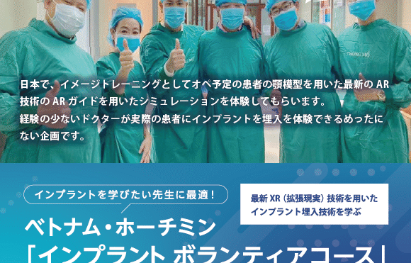 本コースは、最新のXR技術を活用し、日本での事前シミュレーションとベトナ ムでの実践的トレーニングを組み合わせることで、最先端のインプラント埋入 技術の習得を日指します。参加者は、国際的な視点と先進技術を融合させた インプラントのスキルを獲得することができます。